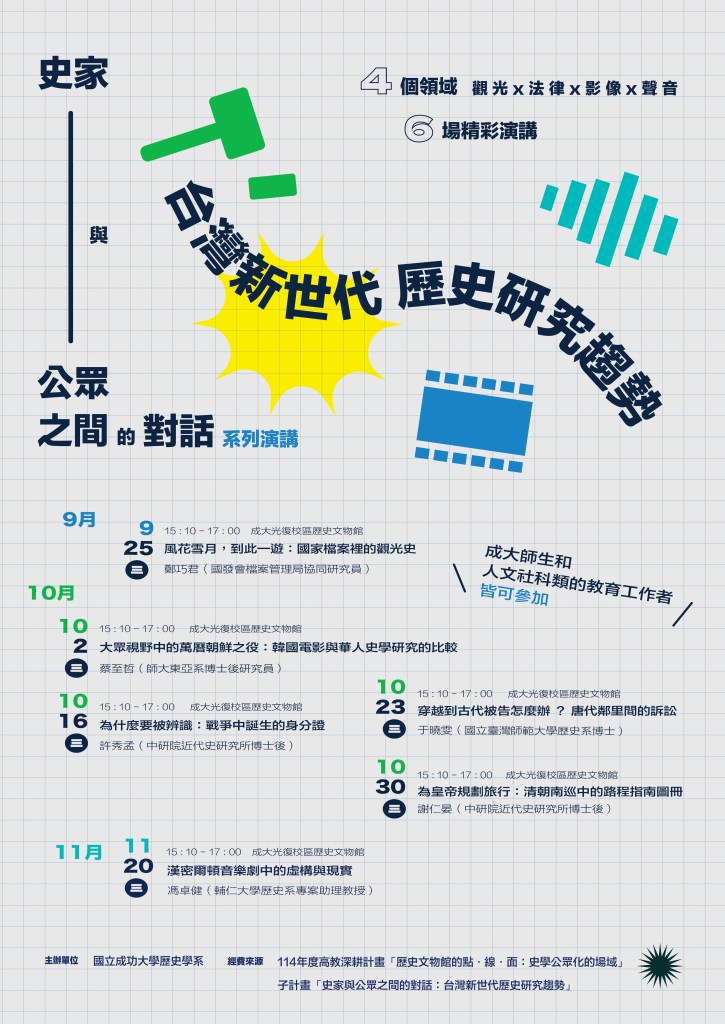 113學年度第一學期,歷史系張哲維老師開設「Podcast歷史科普節目製作」微學分課程。課程主要分為兩大部分。第一、透過「史家與公眾之間的對話:台灣新世代歷史研究趨勢」系列演講,讓學生了解台灣新世代歷史學家的最新研究議題,了解當今歷史學如何面對「公眾」,並以此進一步思考歷史學的未來,及其多元化發展的可能性。第二、教導學生將上述演講內容以Podcast的方式呈現,並製作成每集20~30分鐘的「成大歷史系活動快報」Podcast節目。透過節目製作的過程,讓學生們學習到,如何將生澀的史學知識趣味化、生活化和科普化。