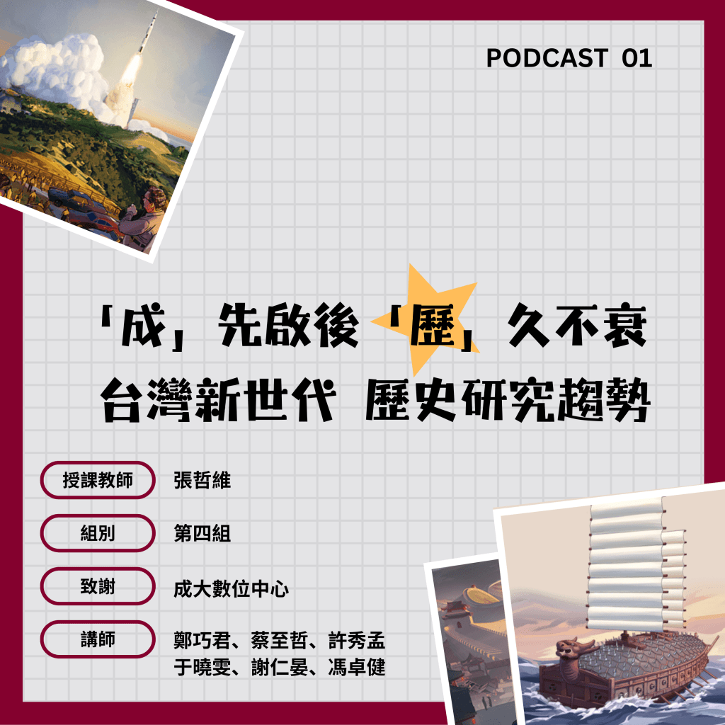 歷史系大三生熱血集結!聊技能、談挑戰、說收穫,揭開團隊生活的瘋狂與成長秘訣。特邀迴聲社造、二十而立等夥伴,帶你解鎖大學生活的無限可能!快來聽聽我們的故事吧!點選圖片或此處即可進入podcast節目中。