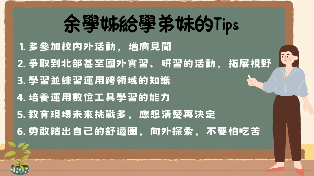 另外學姐也鼓勵我們要盡可能向外探索,拓展自己的視野,南部的資源雖然較為不足,但現在網路十分發達,獲取知識的管道也很多,應該要好好運用,或是利用機會參與校外活動、去北部實習,甚至是往國外交流,不要過於安逸只待在自己的舒適圈,應該要向外持續探索、學習。