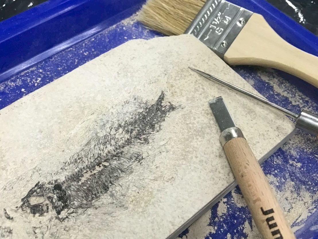 第二項實作是魚矇板化石的清修體驗。老師拿出一批美國懷俄明州綠河層切割運送來的河床切片,每一塊都包含著新生代始新世魚類化石。柯秀穎學姐拿到的那塊標本,表面只能隱約看到一些魚骨的痕跡,需要用專業工具慢慢清理周圍的岩層。老師示範了各種清修工具的使用方法,從傳統的小鑿子、刷子,到現代化的氣動筆。